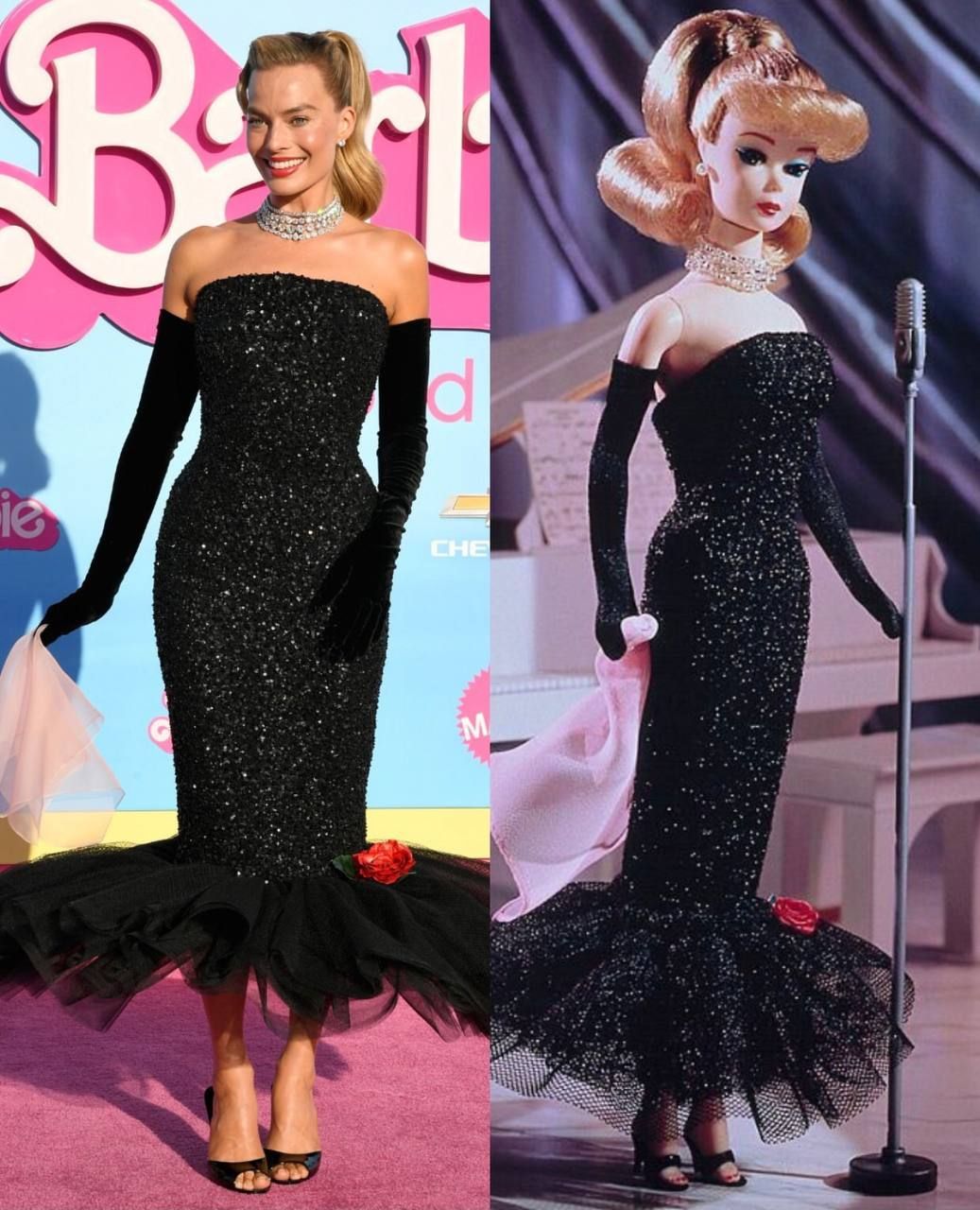 Basın turu boyunca Barbie'nin ikonik kostümlerinin benzerlerini giyerek kameraların karşısına çıkan Margot Robbie'nin prömiyerdeki elbisesi de ilhamını 1960'larda üretilen "Solo in the Spotlight" Barbie'sinden alıyor.