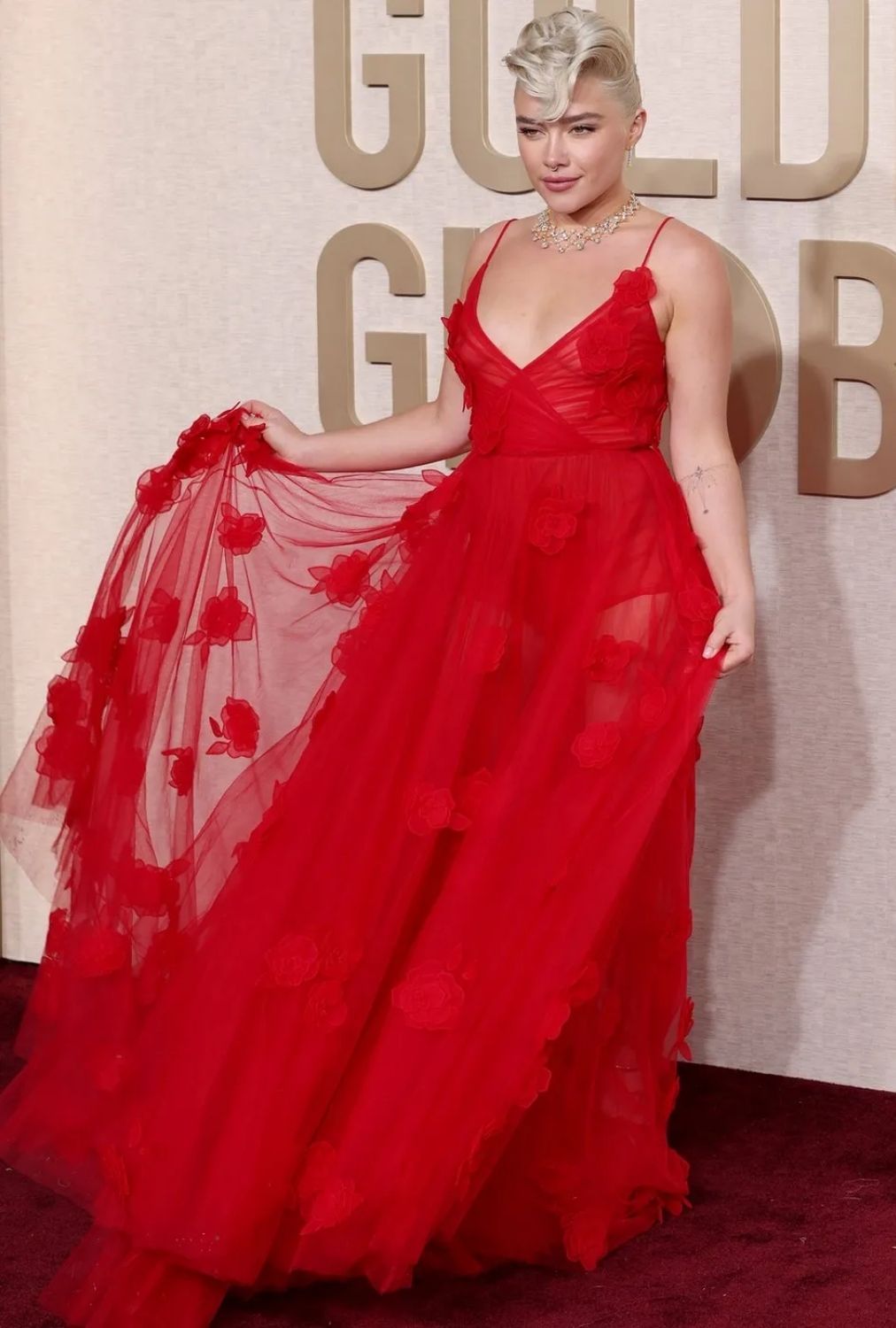 Margot Robbie geceye, "Barbie" basın turlarından alışık olduğumuz şekilde, Barbie'nin ikonik kostümlerinden biriyle katılırken; Julianne Moore, Florence Pugh, Selena Gomez, Ayo Edebiri, Barry Keoghan gibi bir çok isim kırmızının tonlarını cesurca taşıdı.
