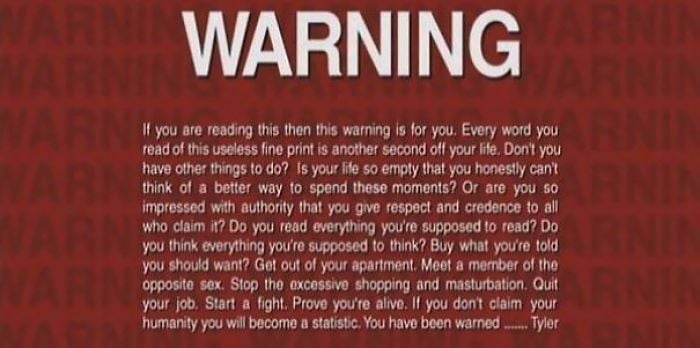 Dövüş Kulübü kendine yakışan bir numarayı daha barındırıyor. Film boyunca Tyler Durden'ın saliselik boy göstermelerinin yanı sıra, filmin girişindeki korsancılığa karşı bildiri bölümünde de aslında Tyler'ın seyircilere mesajı yer alıyor.