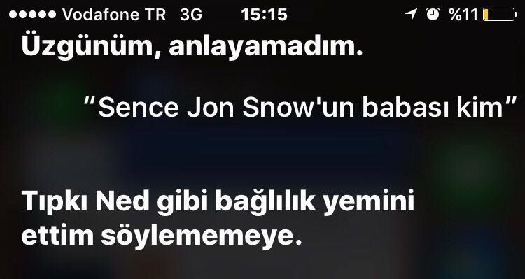Konu ile ilgili bir sürü açıklama ve yorum olsa da en ilginç cevaplardan biri Apple’ın Siri’sinden geldi. Bir kullanıcının “Jon Snow’un babası kim?” sorusuna program “Şöyle diyelim; Snow (Kar)’un içinde biraz ateş var!” şeklinde cevap verdi. Bu bile bize gelecek bölümler adına heyecanlanmak için sebep veriyor.