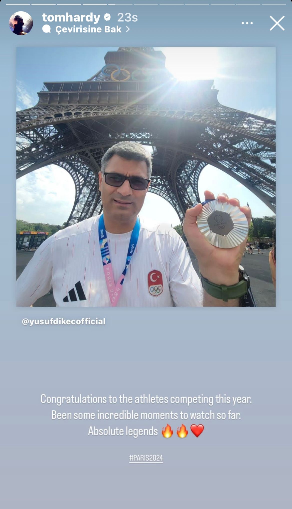 İngiliz aktör Tom Hardy, 2024 Paris Olimpiyatları'da yarışan sporcuları tebrik ettiği Instagram paylaşımlarında, bu yılki oyunların sosyal medyada en çok konuşulan isimlerinden biri haline gelen Yusuf Dikeç'e de yer verdi.
