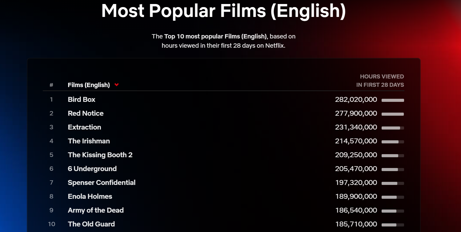 Sitede ayrıca, bir filmin ya da dizinin Netflix'te yayına girdikten sonraki ilk 28 günlük izlenme saatini baz alan bir liste de paylaşılıyor. Bu listeye göre platformun en çok izlenen filmi, ilk 28 günde toplam 282 milyon 20 bin saatlik izlenme rakamına ulaşan Bird Box. Susanne Bier tarafından yönetilen, başrolünde Sandra Bullock'un yer aldığı gerilim filmi Bird Box, platformun en çok ses getiren yapımlarından biri olmuştu.