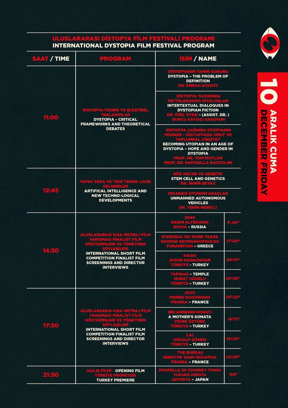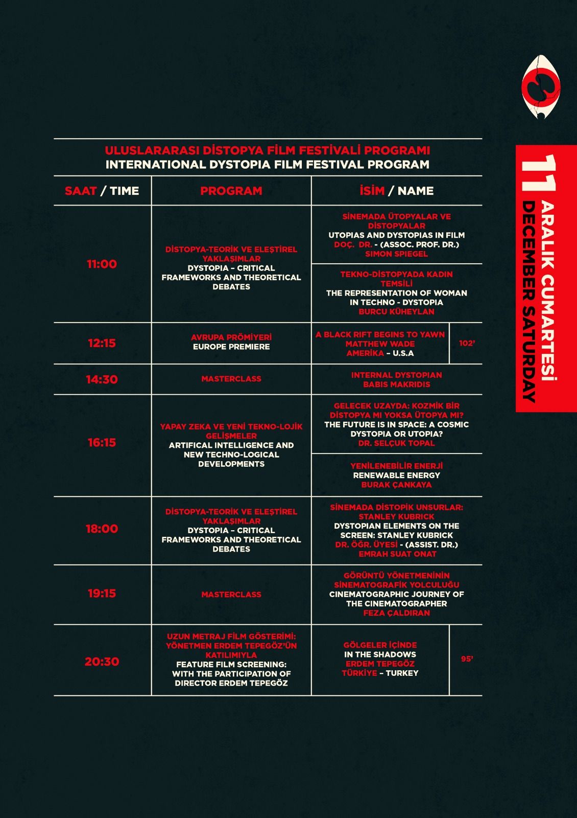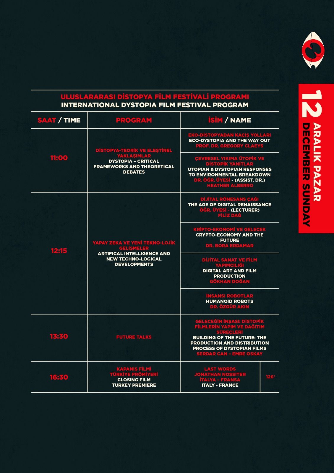 12 Aralık Pazar günü Future Talks programında Emre Oskay ve Serdar Can ile birlikte Distopik Filmlerin Yapım ve Dağıtım Süreci hakkında bilinmeyenler konuşulacak. Distopik filmlerin geleceğine dair bilgilerin aktarılacağı panel, bu konuya merak duyan izleyicilerle buluşacak.