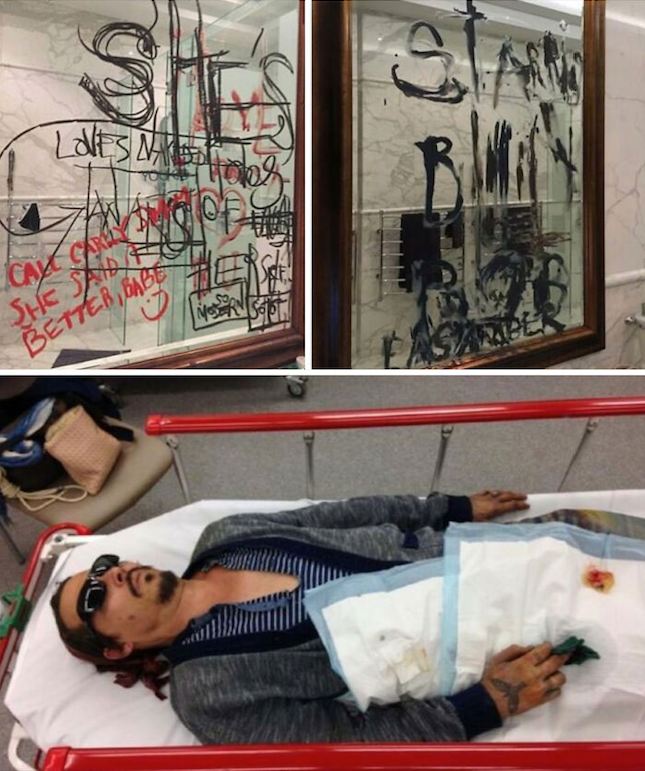 Heard ise Depp'in öfkeyle telefonunu kırarken parmağını kopardığını iddia ediyor. Bu iddia, Johnny Depp'in doktoruna gönderdiği ve kendi parmağını kestiğini söylediği mesajlarla desteklense de Depp yalnızca şaka yaptığını belirtiyor. Yarasını boyaya daldırdığını ve aynalara Heard'ü kendisini Billy Bob Thornton ile aldatmasıyla suçlayan yazılar yazdığını ise kabul ediyor. 24 saat boyunca tıbbi destek almayan Depp daha sonra hastaneye kaldırılıyor ve parmağı dikiliyor.