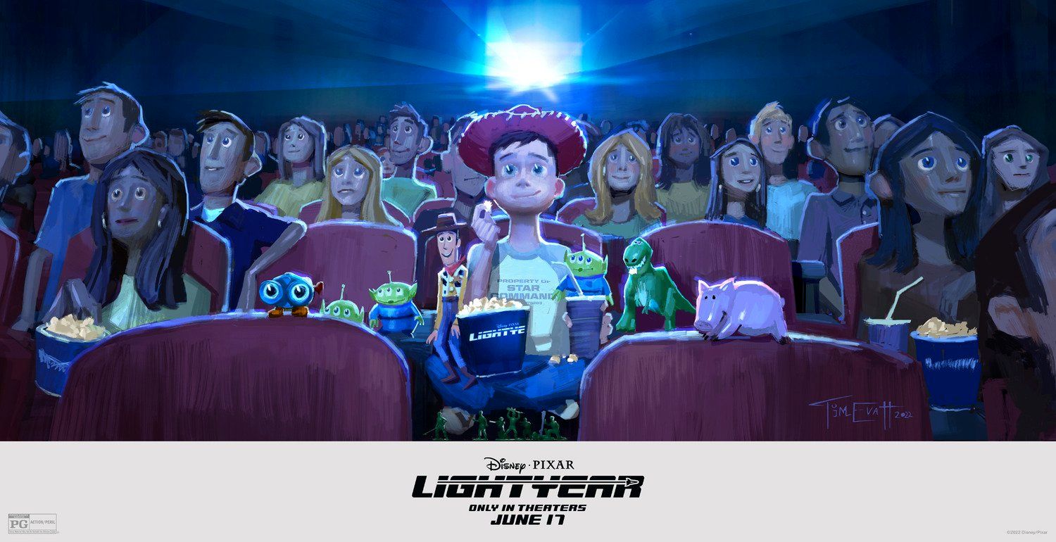 Sinema salonunda Andy'nin yanında oturmakta olan gözde oyuncak Woody'nin pabucu, Buzz'ın gelmesiyle dama atılıyor. Oyuncak Hikayesi filminde gördüğümüz üzere Andy'nin odasındaki her şey - nevresim takımları, posterleri, çizimleri- Woody ve kovboy temasından, Buzz ve uzay temasına dönüyordu. İşte Andy, "Lightyear" filmini izlediği için bu uzay kahramanına hayran olmuştu. Diğer posterde ise Andy'nin elinde Buzz Lightyear oyuncağı ile birlikte hayallerinin kahramanıyla tanıştığını görüyoruz...