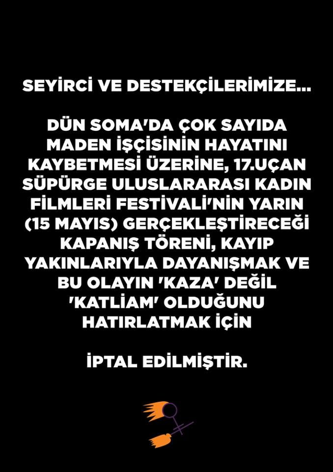 Beyazperde.com'un sponsoru olduğu 17. Uçan Süpürge Uluslararası Kadın Filmleri Festivali Soma'da yaşanan acı olayla ilgili bir bildiri yayınladı.