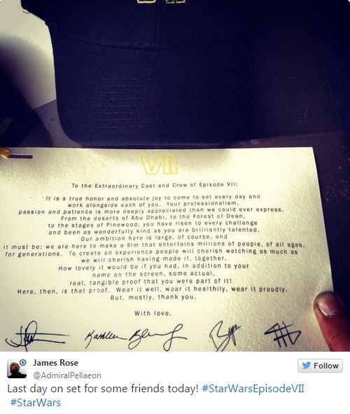 İlk söylentilerin ortaya çıktığı günden itibaren gündemden düşmeyen Star Wars: Episode VII'nin çekimleri sona erdi. Daha önce Görevimiz Tehlike 3, Star Trek ve Super 8 gibi filmlere imzasını atmış J.J. Abrams'ın yönetmen koltuğunda oturduğu filmin çekimlerinin tamamlanması haberi ise Twitter üzerinden duyuruldu. Aynı zamanda filmin yapımcıları arasında olan J.J. Abrams, diğer yapımcılar Kathleen Kennedy ve Bryan Burk ile beraber hazırladıkları bir not yayınladı. Twitter üzerinden yayınlanan not "Bölüm 7'nin olağanüstü oyuncularına ve ekibine" başlığını taşıyor.