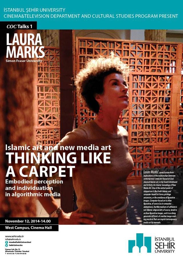 İstanbul Şehir Üniversitesi, önümüzdeki günlerde çok önemli bir ismi ağırlayacak. Kanada Simon Fraser Üniversitesi'nden Prof. Laura Marks, konuşma yapmak üzere İstanbul'a gelecek.