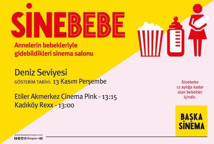"Bebekler mutlu, anneler mutlu, yaşasın sinema!" diyen Başka Sinema, SİNEBEBE gösterimlerine devam ediyor. Anneler SİNEBEBE'de bebekleriyle birlikte rahat rahat film seyrediyor. Salonda bebek arabaları serbest, bebeklerin ağlaması serbest, uyuması serbest, beslenmesi serbest, oyuncakları serbest! 25 Mart'ta ilk seansı düzenlenen ve büyük ilgi gören SİNEBEBE de bu ay; Nisan Dağ ile Esra Saydam'ın yönetmenliğini üstlendiği ödüllü Deniz Seviyesi filmi gösterilecek.