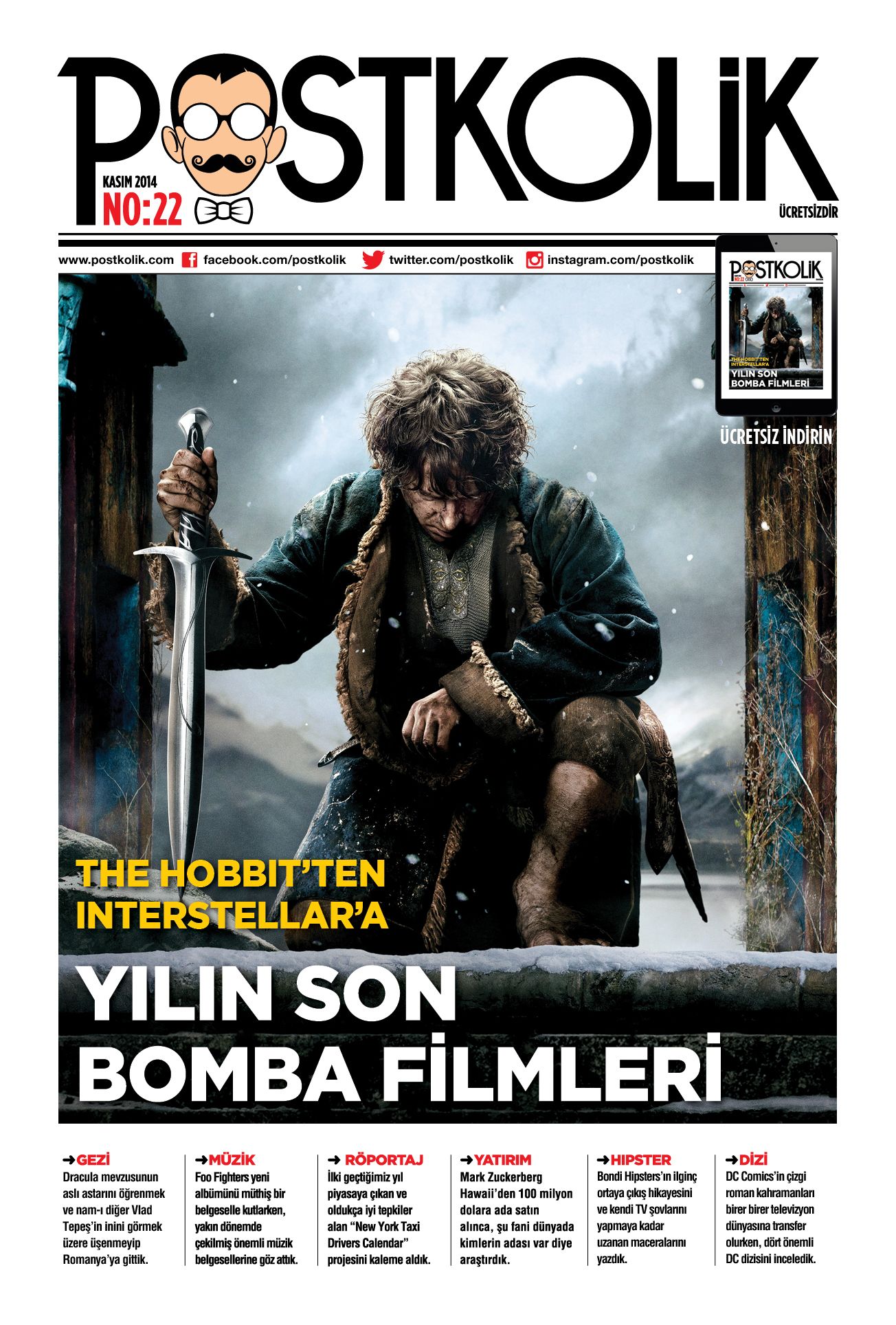 Türkiye’nin en çok konuşulan gençlik/yaşam stili dergileri arasına kısa sürede girerek özellikle işlediği konular ve 30 binin üzerinde okuyucusuyla appstore’un en popüler dergilerinden biri Postkolik, Kasım sayısında dolu dolu 48 sayfalık bir içerikle okuyucularına ulaşıyor. Bu yılın en çok merak edilen filmleri The Hobbit: The Battle of Five Armies ve Interstellar, Postkolik farkıyla inceleniyor.