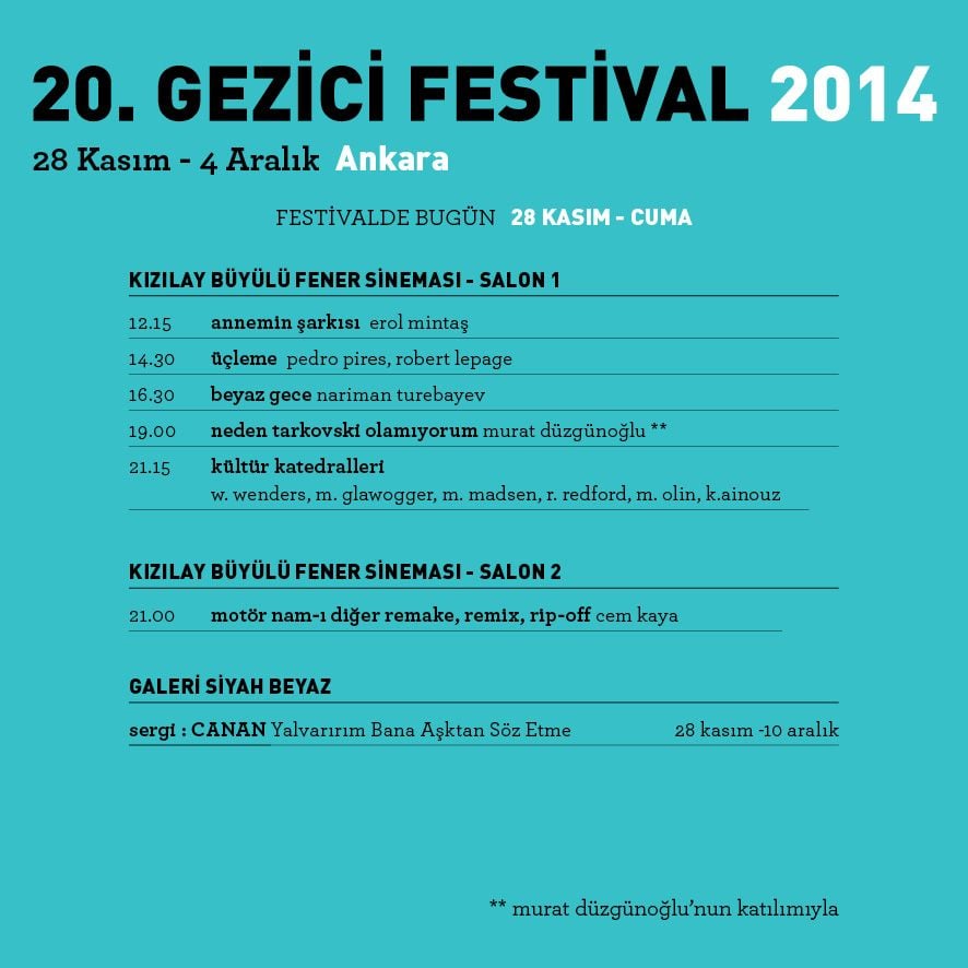 1995’ten bu yana dünya ve Türkiye sinemasının en yeni örneklerini izleyicisiyle buluşturan Gezici Festival seyircisini, 20’nci yılda da birçok sürpriz bekliyor. Filmler, Ankara Kızılay Büyülü Fener Sineması ve Çağdaş Sanatlar Merkezi’nde başkent seyircisiyle buluşacak. Eskişehir ve Sinop’taki gösterimler ise Eskişehir Anadolu Üniversitesi Sinema Salonu ve Sinop Halk Eğitim Merkezi’nde gerçekleşecek. Çankaya Belediyesi’nin katkılarıyla, Çağdaş Sanatlar Merkezi’nde ve Sinop Kültür ve Turizm Derneği’nin katkılarıyla Sinop’ta yapılacak tüm gösterimler ücretsiz gerçekleşecek.