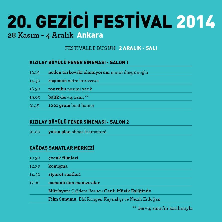 Sinemanın seçkin örneklerini Türkiye’nin değişik kentlerindeki sinemaseverlerle buluşturmak ve Türkiye sinemasını dünyaya tanıtmak için tam 20 yıldır yollarda olan Gezici Festival'de bugün; Murat Düzgünoğlu imzalı Neden Tarkovski Olamıyorum?, usta yönetmen Akira Kurosawa'nın hem senaryosunu yazdığı hem de yönetmenliğini üstlendiği 1950 yapımı Rashômon filmi ve Nesimi Yetik'in draması Toz Ruhu gibi filmler gösterimde olacak. Festivalde ayrıca başrollerini Bülent İnal, Sanem Çelik ve Myraslava Kostyeva Akay'ın paylaştığı Balık filmi, yönetmeni Derviş Zaim katılımıyla festival izleyicileriyle buluşacak. 20. Gezici Festival kapsamında bugün, “Osmanlı’dan Manzaralar” Elif Röngen-Kaynakçı’nın derlediği filmler de saat 17:00'de Ankara Çağdaş Sanatlar Merkezi'nde izleyicilerle buluşacak.
