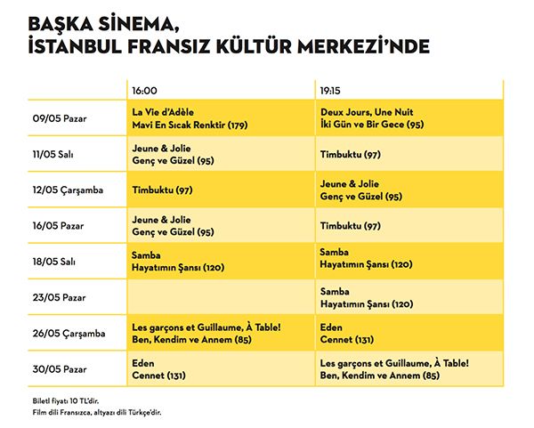 Başka Sinema yoluna büyük heyecanlar ile devam ediyor. Başka Sinema 9 Mayıs 2015 tarihinden itibaren İstanbul Fransız Kültür Merkezi'nde olacak!