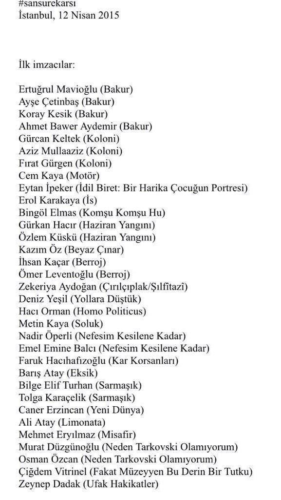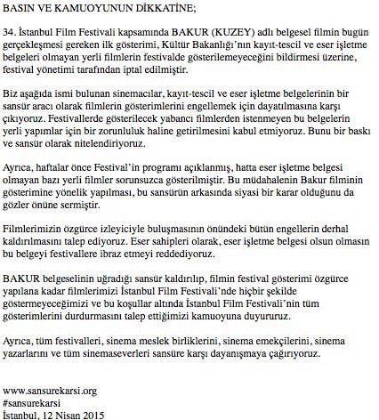 Antalya Film Festivali'nde de yine bir belgesel filmin sansürlenmiş olmasının ardından yaşanan bu gelişme, sinema ve sanat üzerindeki baskının sistematik olarak devam ettirildigini göstermektedir. Bakur’un gösteriminin iptal edilmiş olmasını sansür olarak değerlendirdiğimizi kamuoyuyla paylaşmak istiyor ve herkesi sansüre karşı dayanışmaya çağırıyoruz. Bakur'un gösterilmesinin engellenmesine bahane olarak işletme belgesi alma koşulu gösterilmektedir. Festivallerde gösterilen yabancı filmlerden istenmeyen eser işletme belgesinin yerli filmlerden istenmesi uygulamasına derhal son verilmesini ve mevzuatta bu yönde değişiklik yapılmasını talep ediyoruz. Bu duruma tepki gösteren ve Festival’den filmlerini çektiklerini açıklayan sinemacılarla dayanışma içinde olduğumuzu duyuruyoruz.