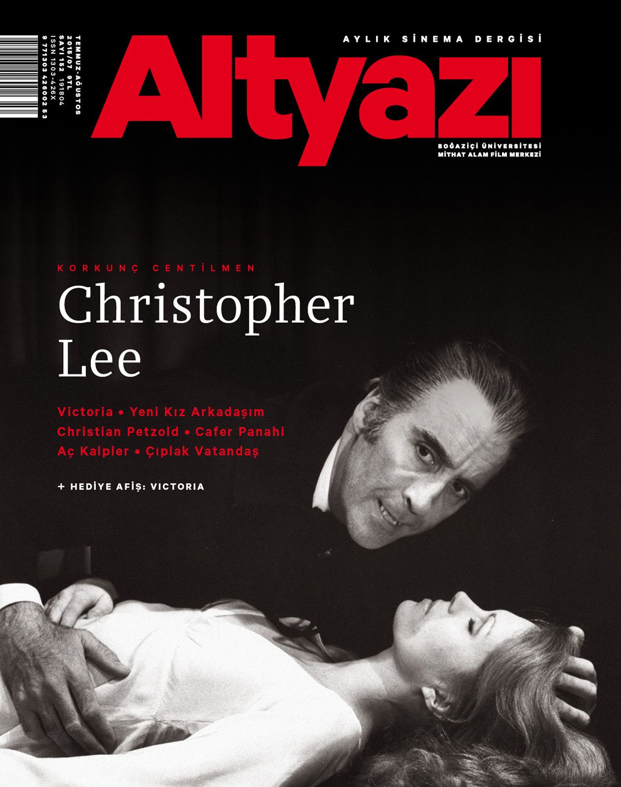 Altyazı Aylık Sinema Dergisi'nin Haziran ayında kaybettiğimiz unutulmaz rollerde izleyicinin hafızasına kazınan ünlü oyuncu Christopher Lee'yi kapağa taşıdığı Temmuz-Ağustos sayısı iki ay süresince okurları bekliyor olacak. Derginin yanında verilen bu ayki hediye afiş ise Berlin Film Festivali'nin ses getiren filmlerinden Victoria'nın afişi olacak.