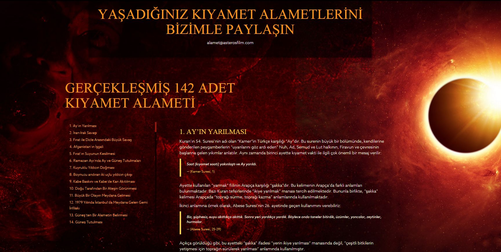 Filmle ilgili pek çok detayı bulacağınız sitede, bahsedilen kıyamet alametlerinin detayları da yer alıyor. Ayrıca sitede kendi başınızdan geçen, size göre kıyamet alameti sayılabilecek olayları da paylaşabilirsiniz!