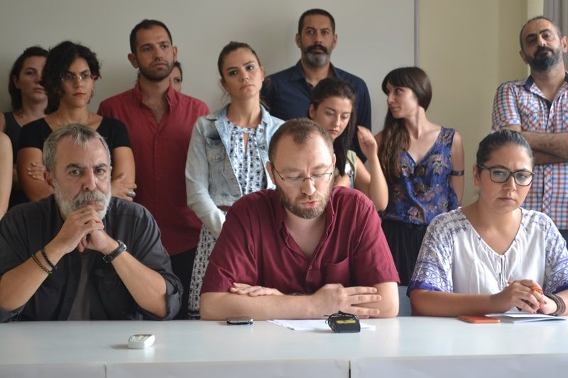 20 tiyatrocuyla birlikte uzaklaştırılan Sevinç Erbulak'ın da hazır bulunduğu toplantıda oyuncu ve İBBŞT eski Genel Sanat Yönetmeni Orhan Alkaya da söz aldı. Haklarını aramaya devam edeceklerini söyleyen Oyuncular Sendikası yönetim kurulu üyesi Sercan Gidişoğlu, basın açıklamasında "Bizler böylesi bir kurumda sanatçıların ihale ile taşeron şirketler üzerinden alınıp satılmasının utancı ile baş etmeye çalışırken, bu hukuksuz çalışma düzeni ve mevcut OHAL’e sırtını yaslamış, kim olduğunu kurumun kendisinin dahi bilmediği kişi ya da kişilerce hazırlanan, amacı ve niyeti belirsiz bir liste ile yirmi oyuncunun ekmeği ile oynanmasını kabul etmiyoruz!" diye konuştu. Basın açıklamasında "OHAL kapsamında sakıncalı bulunacak birileri varsa, İBBŞT gibi kamuoyunun gözü önünde olan bir kurumda, böylesi bir süreçte mesnetsiz bir liste ile yirmi sözleşmeli meslektaşımızın işten atılmasına neden olan kişi ya da kişilerdir!" ibaresi de yer aldı.
