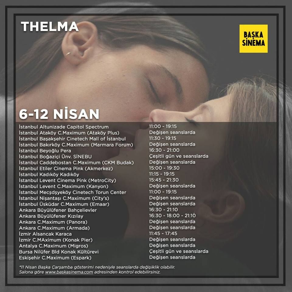 "Tekrar", "Oslo, 31 Ağustos" ve "Sessiz Çığlık " filmlerinin yönetmeni Joachim Trier'in son filmi Thelma, 90. Oscar yarışında En İyi Yabancı Dilde Film için Norveç'in gönderdiği adaydı. Toronto, Stockholm, Vancouver ve San Diego gibi uluslararası festivallerde seyircilerin karşısına çıkan "Thelma"nın Mar del Plata Film Festivali'nden de 3 ödülü bulunuyor. Filmin başrollerini Eili Harboe ve Kaya Wilkins paylaşıyor.