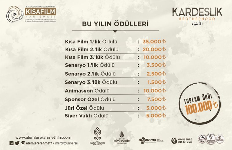 5. Alemlere Rahmet Uluslararası Kısa Film ve Senaryo Yarışması'nda "Kısa Film", "Kısa Film Senaryo" ve "Animasyon" dallarında başvurular devam ediyor. Bu yılki teması "Kardeşlik" olan kısa film festivalinde ödüle layık görülen senaryolara İstanbul içerisinde olmak şartıyla çekim desteği verileceği açıklandı.