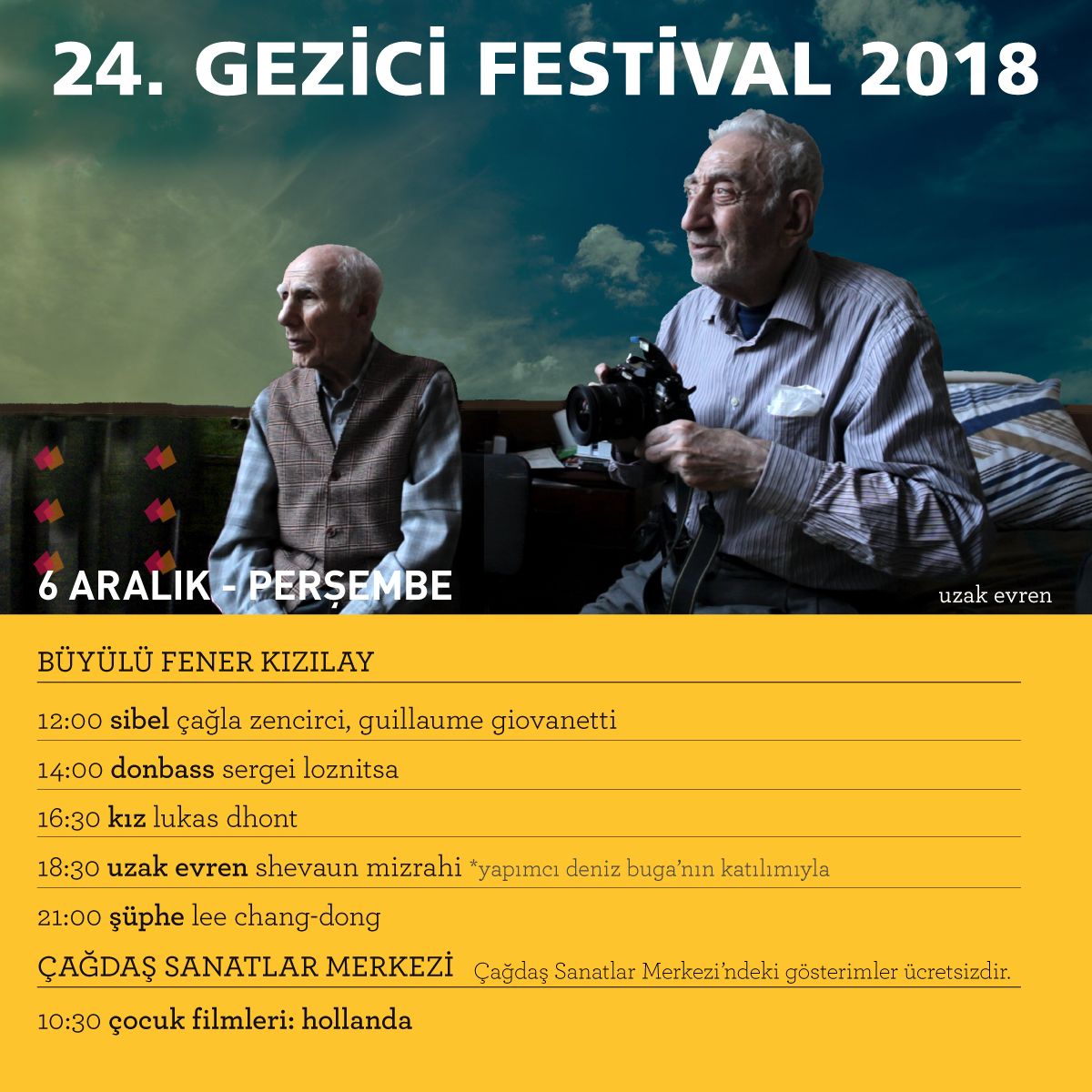 Büyülü Fener Kızılay sinemasında gösterimler 12:00'de başlıyor. Bu seansta Türkiye Sineması bölümünde yer alan Sibel filmi seyircilerle buluşacak. Film, Adana Film Festivali'nden En İyi Film ve başrolü Damla Sönmez ile En İyi Kadın Oyuncu ödüllerini kazanmıştı. Dünya prömiyerini yaptığı Locarno Film Festivali’nden üç ödülle dönen Sibel, Kuşköy’de yaşayan ve ıslık diliyle konuşan 25 yaşındaki Sibel’in öyküsünü anlatıyor. 14:00 seansında Ukrayna'nın bu yıl Yabancı Dilde En İyi Film Oscar ödülü aday adayı olarak göndereceği Donbass seyircilerin karşısına çıkacak. 16:30 seansında ise Belçika'nın Oscar aday adayı Kız filmi yer alıyor. Balerin olmak isteyen on beş yaşındaki Lara’nın öyküsünü anlatan "Kız", Avrupa sinemasının en prestijli ödülüne En İyi Film, Keşif Ödülü – FIPRESCI ve En İyi Erkek Oyuncu (Victor Polster) dallarında aday... Seçki 18:30'da iki jenerasyon arasında bağ kurmaya çalışan belgesel Uzak Evren ile devam ediyor. Gösterim, yapımcı Deniz Buga'nın katılımıyla gerçekleşecek. Seçkiyi sonlandıran ise 21:00 seansında seyircilerle buluşacak olan, Güney Kore yapımı Şüphe filmi olacak. Cannes’dan FIPRESCI ödülüyle dönen "Şüphe", Bağımsız Ruh Ödülleri’ne En İyi Uluslararası Film dalında aday gösterildi.